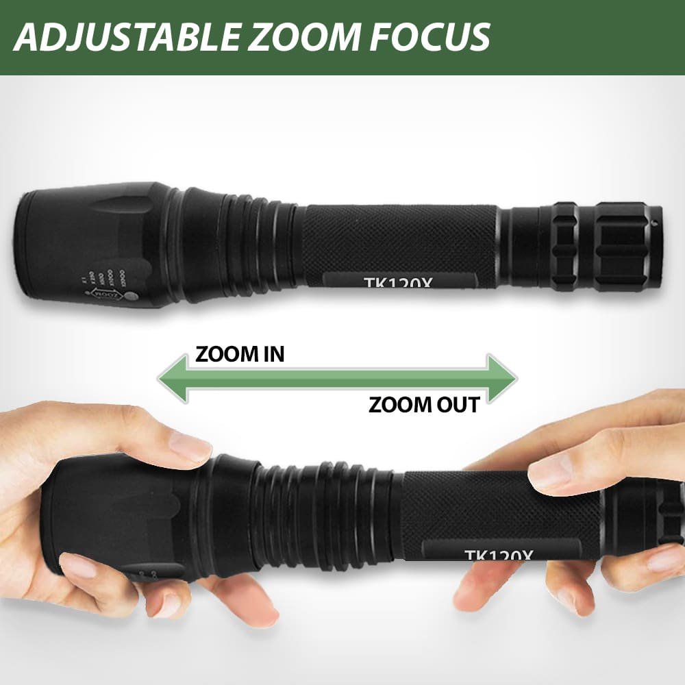 One of the important features of this LED flashlight is the zoom lens. It’s ideal for many situations from hunting and camping to security work. The Adjustable Focus Zoom on the TK120X LED Tactical Flashlight allows you to shine the light beam on a targeted area. It can even be something in the distance. You might need enhanced light on a moonless night to spot a deer or an owl in a tree. Security guards often need to see exactly what something is even in a dark warehouse. It might be a stray animal but it could be a thief. You need to know.